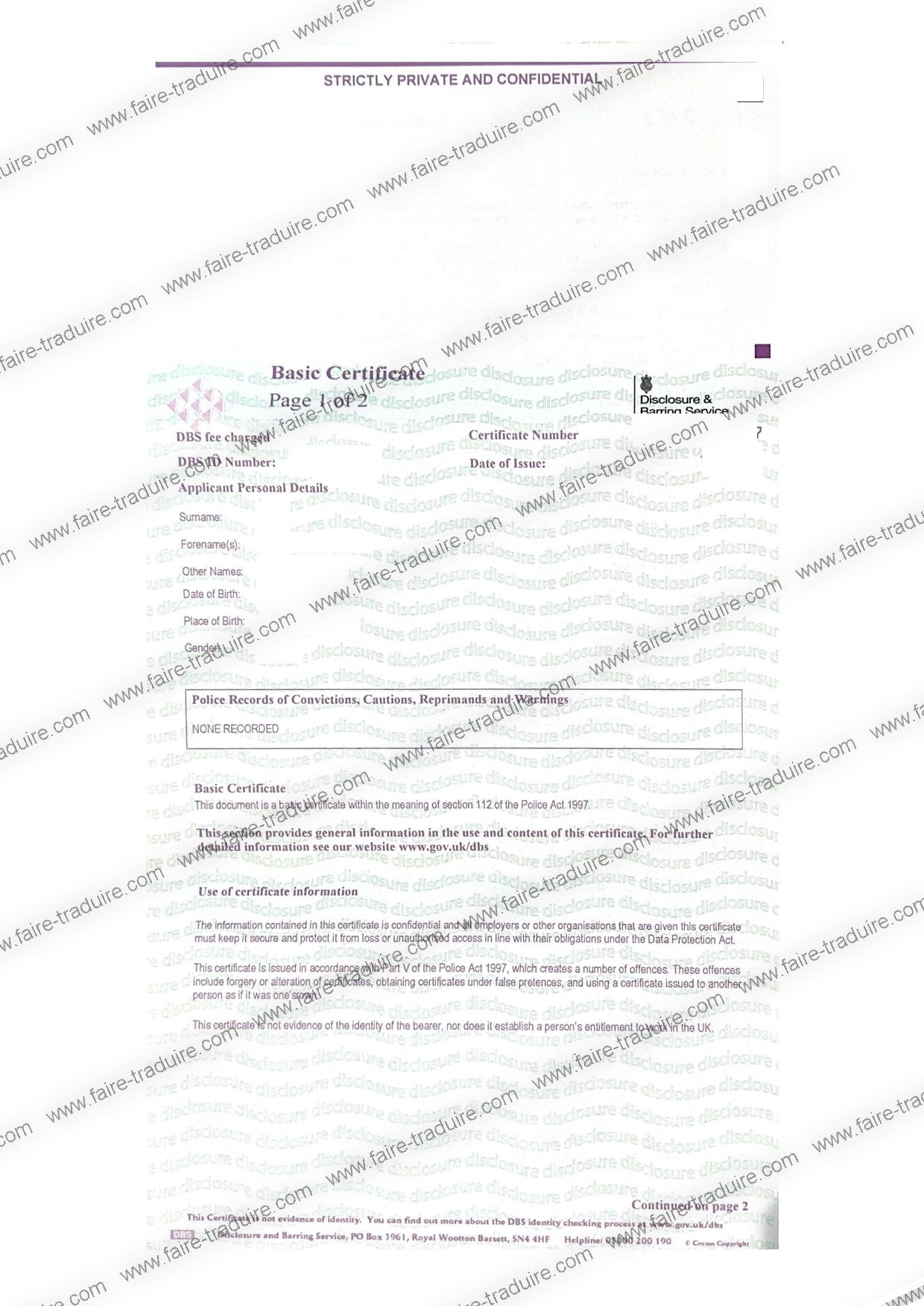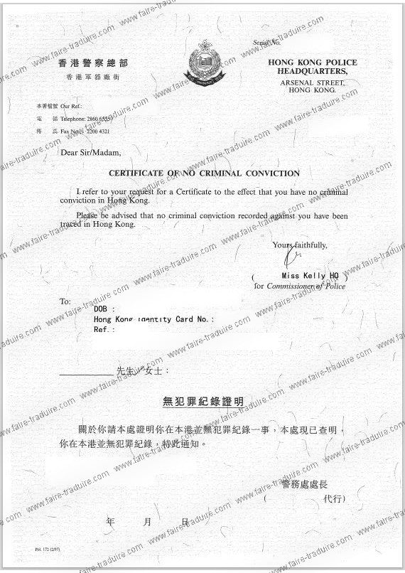 Sworn translation into French of a criminal record issued in English (FBI for the United States, DBS and ACRO for Great Britain, NBI for the Philippines, GDCI for the United Arab Emirates, NCB for Iran, NPC for Australia, CNCC for Hong Kong, CIB for Jamaica, record from the Embassy of India, SAPS for South Africa)